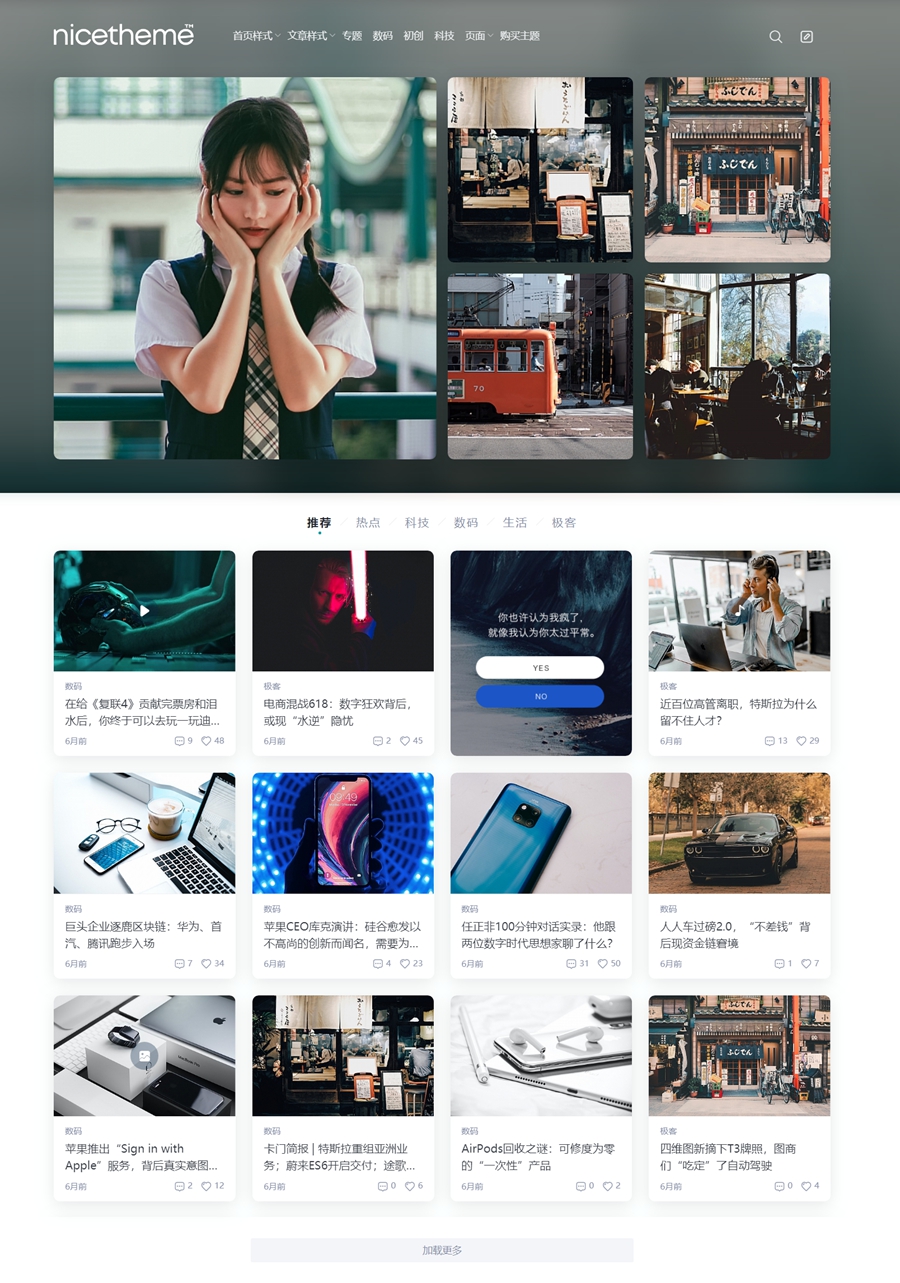 响应和视网膜 适用于所有设备,支持高质量的图像和文字。 出色的seo优化 内置经过长期验证的、强大的SEO策略,可自动获取也可自定义的seo机制 Bigger share-社交分享2.0 nicetheme独创功能,每篇文章可生成一张封面图片,让文章在微博、朋友圈更有范。 专题归纳 列表页可插入文章专题栏目,网站干货一目了然 列表自动加载 后台可选择AJAX加载和分页加载列表文章,AJAX加载自动加载前2页 6种文章样式 多达6种文章样式,视频、文章、相册、图片都能得到淋漓尽致的展示 评论支持AJAX回复及加载 重置WP评论机制,支持添加表情/图片/链接。有邮件提醒、验证码反垃圾评论机制 多样的广告位 文章列表及文章页内置广告位,PC和WAP单独设置 数十个WP优化 针对wordpress进行数十种本地化优化,拒绝龟速加载速度 十多个小工具 重新设计默认小工具、新增广告、文章(按评论、浏览、点赞等排序)小工具 好用的主题配置后台 强大的后台配置框架,清晰有序的设置模块,小白也能快速配置